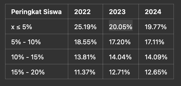 Berdasarkan data dari tahun sebelumnya, persentase penerimaan SNBP berdasarkan peringkat siswa dalam kelasnya adalah sebagai berikut: