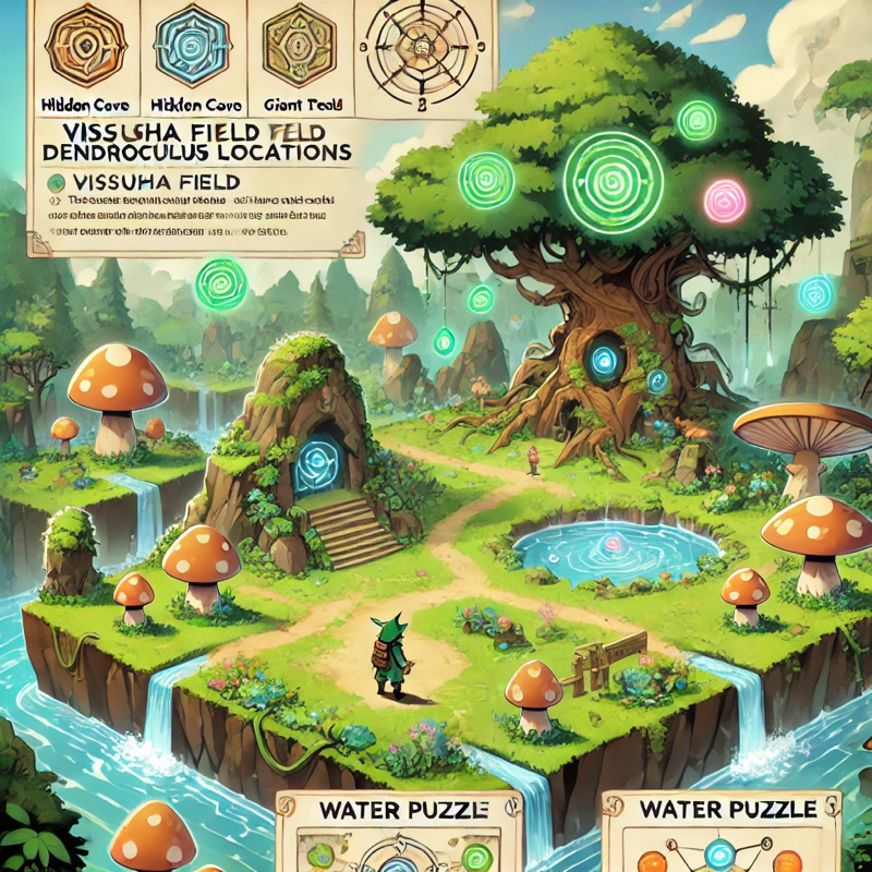 Vissudha Field punya medan yang rumit, penuh gua, akar pohon, jamur raksasa, dan struktur kuno. Berikut beberapa pola lokasi Dendroculus yang sering ditemukan: