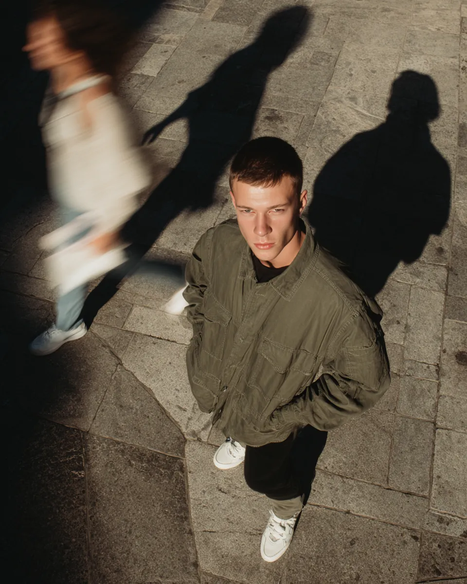 Prompt: Create an editorial fashion photograph of a handsome male model in his mid-20s, wearing Tactical jacket Standing on the street with shadows of people moving around him, he has short hair, and looks directly at camera. He wears white sneakers. The scene captures motion blur as they pass by. shot from above. Use soft lighting to cast gentle shadows and enhance texture details. for magazine cover. shot using Fujifilm X-T4, cinematic color grading, hyper realisti –ar 4:5 –profile ghy9fcl –v 7