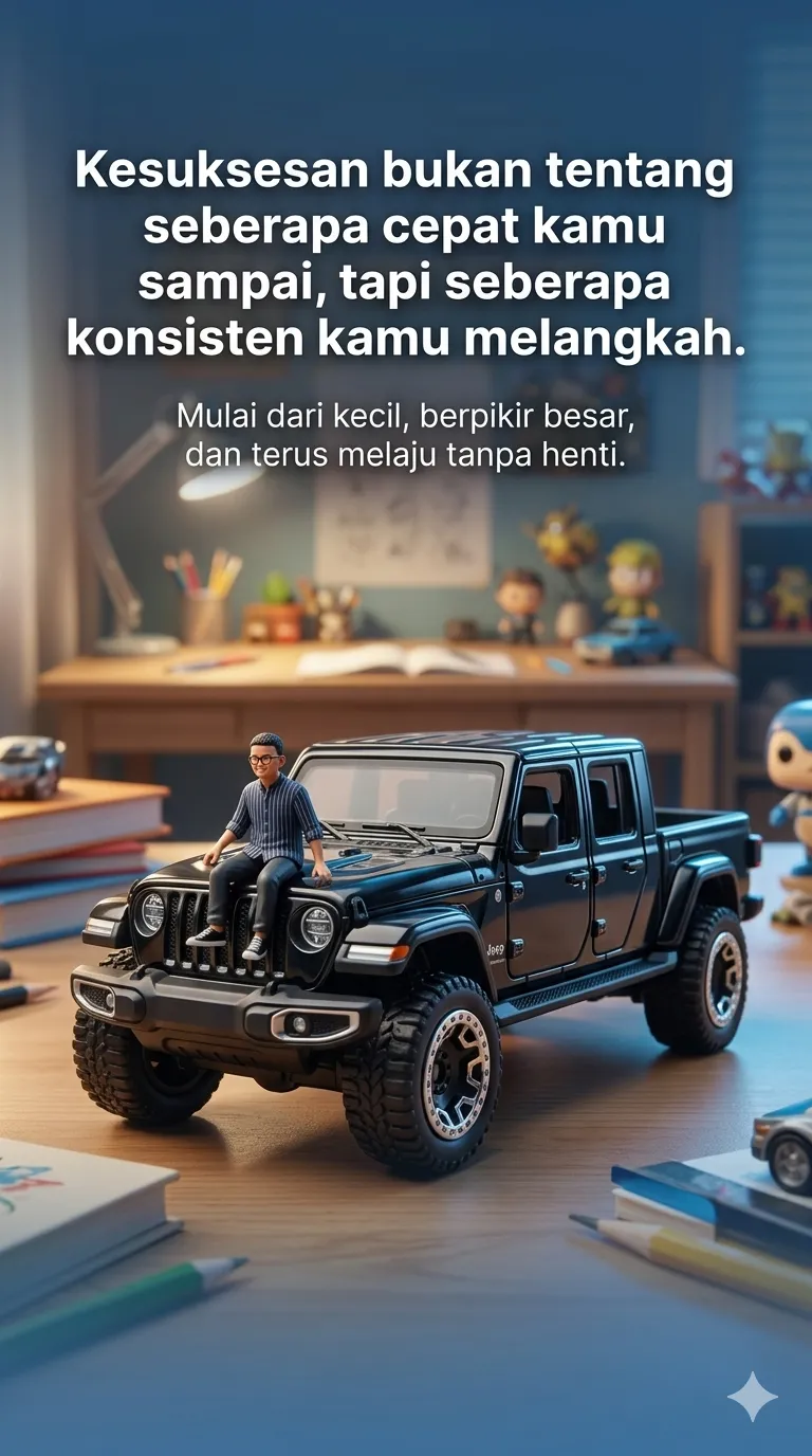 Create a highly detailed cinematic fantasy-realistic poster in 9:16 aspect ratio. Main Subject: Transform the car from the provided photo into a premium diecast toy car (Hot Wheels style but without packaging). Style it as a collectible miniature: glossy metallic paint slightly exaggerated sporty proportions ultra-detailed rims and tires visible panel lines like real diecast subtle toy-scale imperfections for realism placed on a flat surface like a desk Character: Include a miniature human figure based on the provided person photo. The person is sitting casually on top of the diecast car (on roof or hood) Expression: happy, proud, playful Scale: as small as a pencil (tiny compared to the car) Natural pose, interacting with the car like it’s a big object Environment: Background is a cozy children’s study bedroom: desk, books, stationery, lamp, toys softly blurred (depth of field / bokeh) overlay with a smooth transparent blue gradient for a modern poster feel Lighting: cinematic soft lighting highlight reflections on glossy diecast surface mix of warm room light + cool blue tones slight glow for dreamy effect Composition: diecast car as main focus (center) tiny person sitting on top (upper focal point) clean negative space for text shallow depth of field Typography: Top (bold inspirational quote): ” “Ketika kamu berani mencoba sesuatu yang baru, di situlah peluang besar mulai terbuka.”.” Sub text: “Think new. Start small. Go big.”.” Color Tone: dominant blue gradient overlay warm + cool cinematic balance premium inspirational poster look Style Keywords: ultra realistic, macro toy photography, diecast car, cinematic lighting, depth of field, fantasy realism, miniature world, glossy reflection, inspirational poster