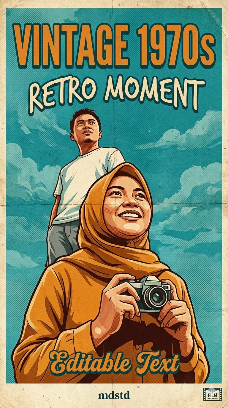 Vintage 1970s Indonesian movie poster style. Grainy texture, retro color palette (orange, teal, cream). The character from the photo in a classic pose. Retro typography. Text on design: “[EDITABLE]”, “[EDITABLE]”, “[EDITABLE]”. Old paper effect, nostalgic vibe, aspect ratio 4:5. footer: […]